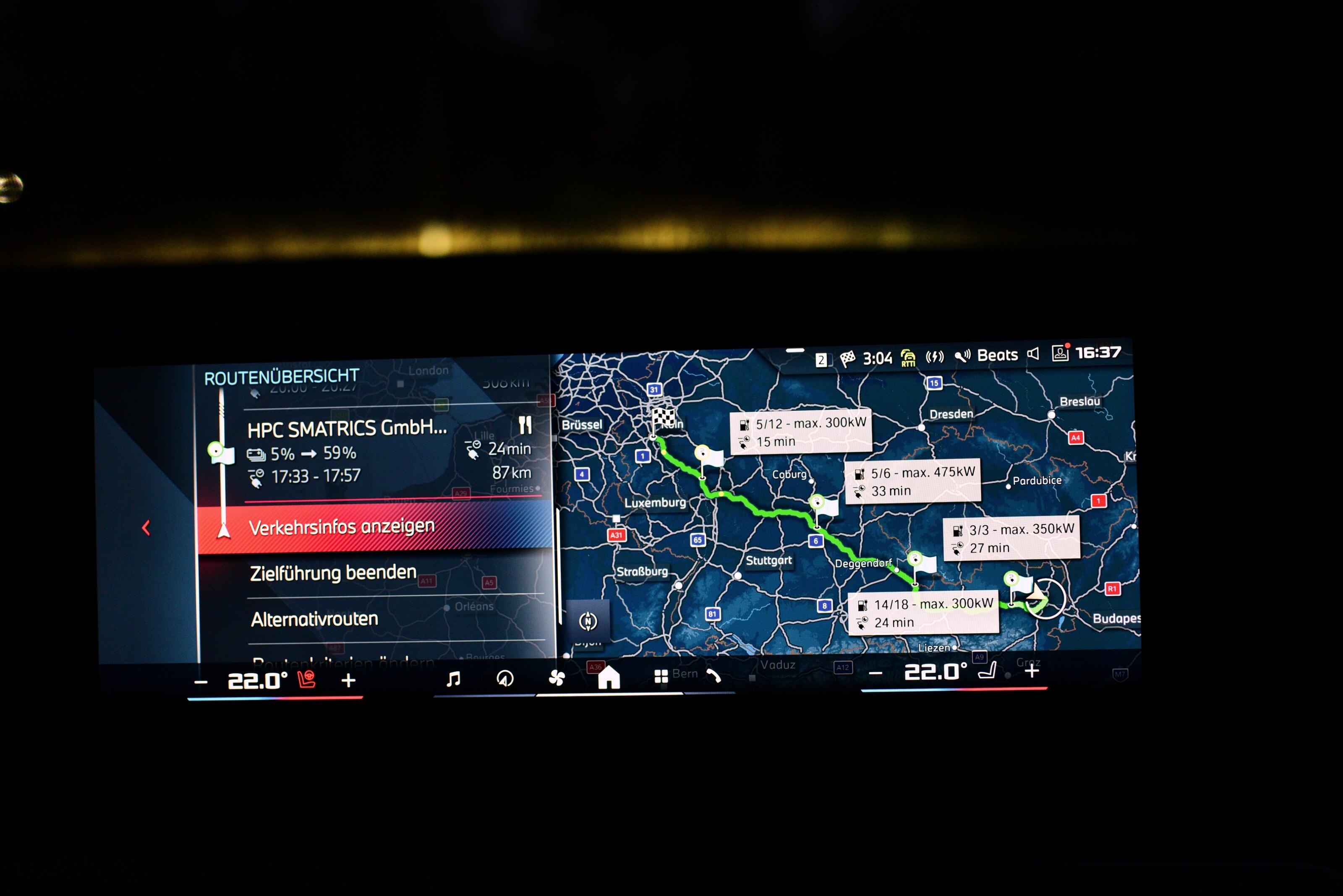 Für die dynamische Reichweitenberechnung im Konfigurator werden diese nicht miteinbezogen. 600 Kilometer sind es jedenfalls, die der BMW iX M70 xDrive auf dem Rollenprüfstand im genormten Zyklus (WLTP) zurücklegen kann. Mehr geht beim stärksten iX nicht. 20,6 kWh/100 km sind der zertifizierte Verbrauch, also inkl. Ladeverluste bei AC-Ladung. AC kann er mit maximal 32 Ampere aka 22 kW nachladen. Bis seine 108,9 kWh Nettokapazität aufgefüllt sind, dauert es also etwa 5,5 Stunden. An der 11 kW-Wallbox dementsprechend etwa doppelt so lange. Am DC-Schnelllader sind es laut Datenblatt 35 Minuten von 10 auf 80 Prozent und somit leider kein Vorzeigewert für ein 2025er Auto. Im Test hält er die maximalen 194 kW (195 kW stehen im Datenblatt) über weite Strecken und schafft das Nachladen schlussendlich in 34 Minuten.