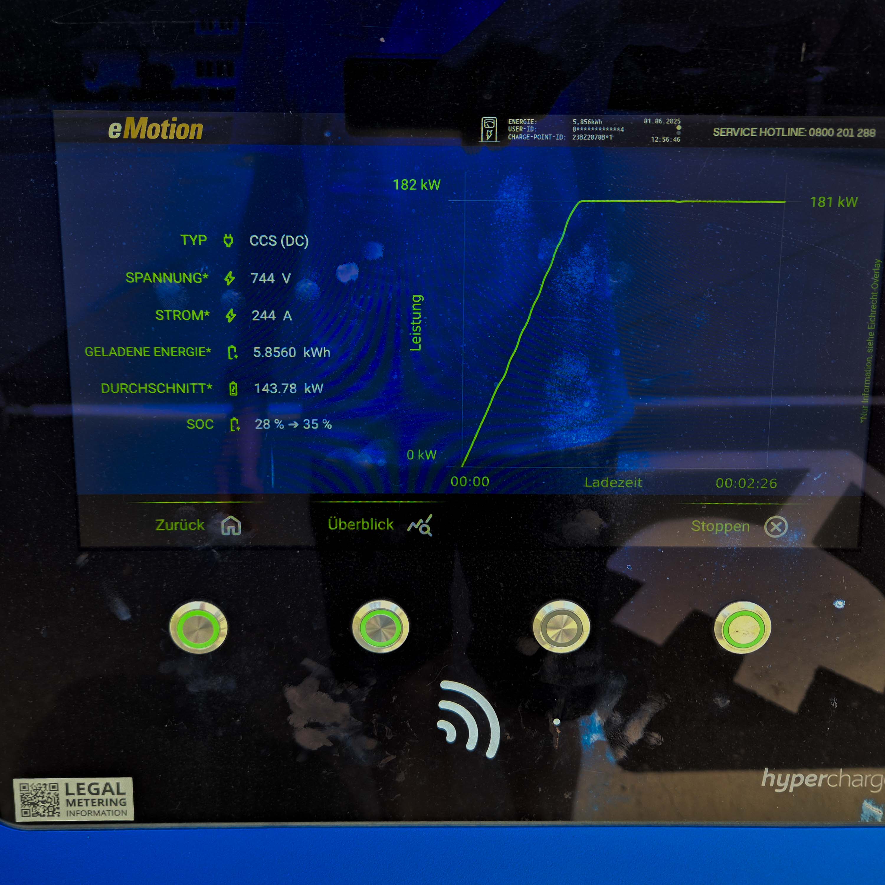 Die neu verbaute 84‑kWh‑Batterie (statt der früheren 77,4 kWh) lässt die WLTP‑Reichweite um 12,5 Prozent auf bis zu 570 km steigen. Die Ladeleistung bleibt, dank 800-Volt-Batteriesystem, mit 225 kW stark und verspricht weiterhin Ladezeiten von 10 auf 80 Prozent in 18 Minuten. In meinem Ladetest, der leider erst bei 28 Prozent gestartet hat, lag die maximale Leistung bei 181 kW. Das erinnert sehr an die Ladekurve beim Test des Prefacelifts im Mai 2022.