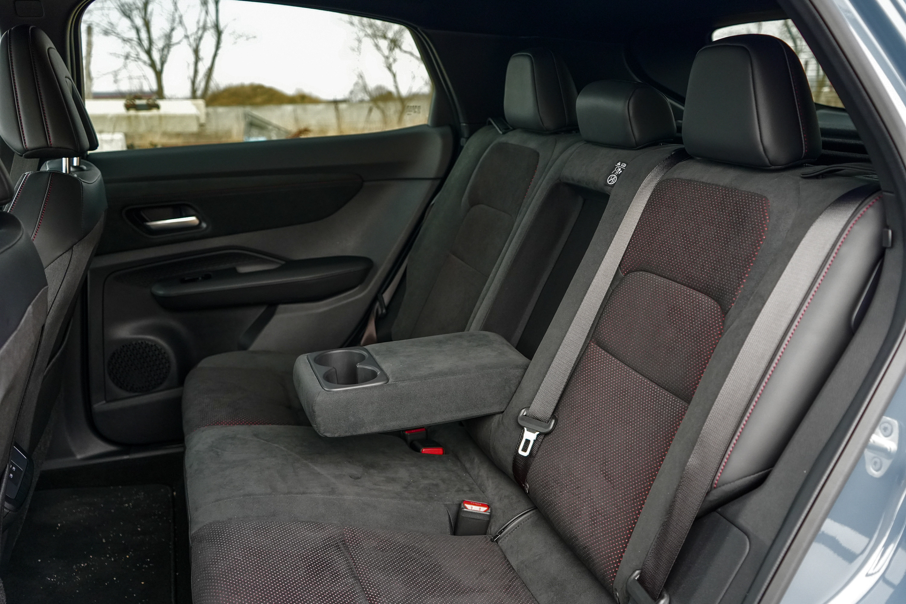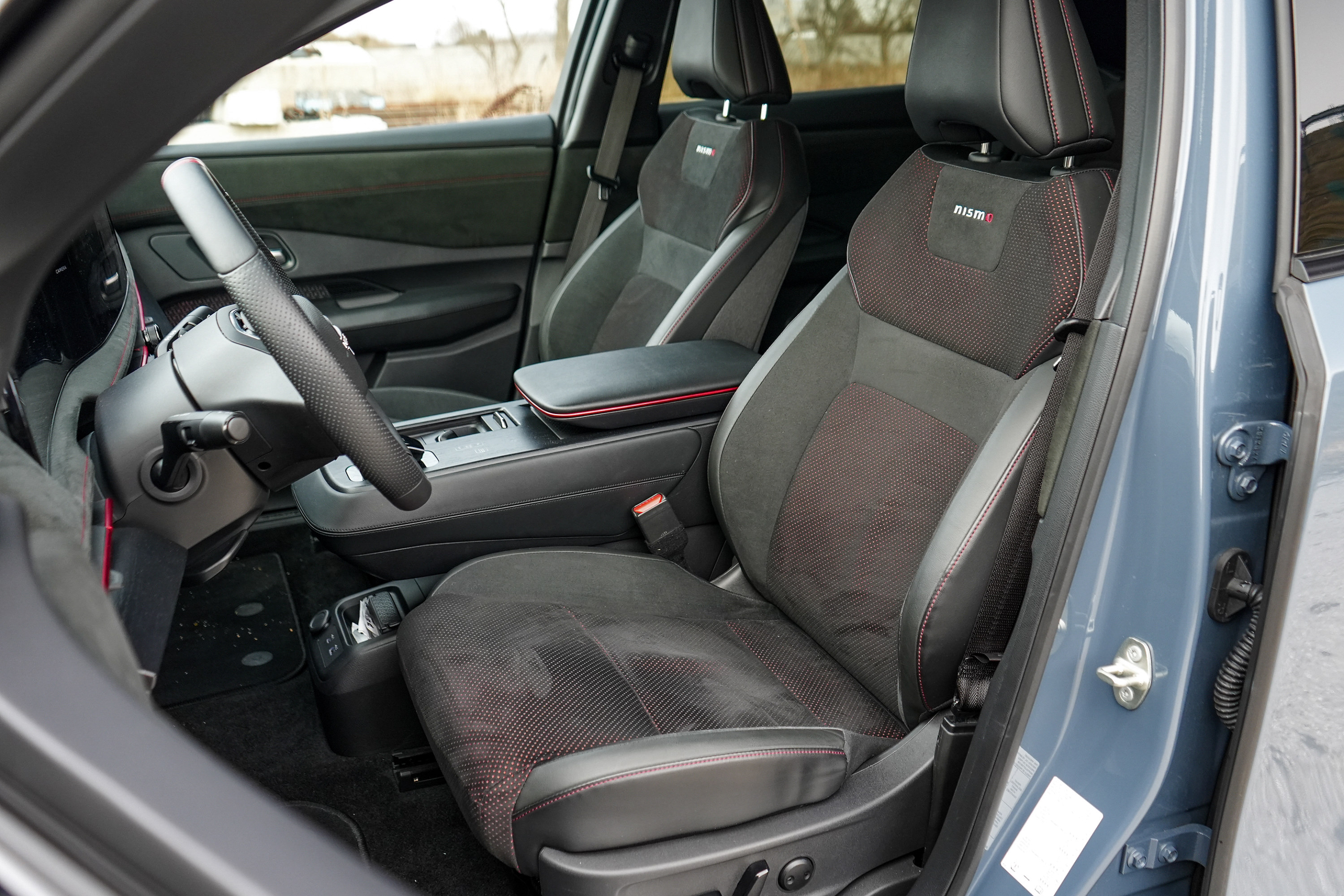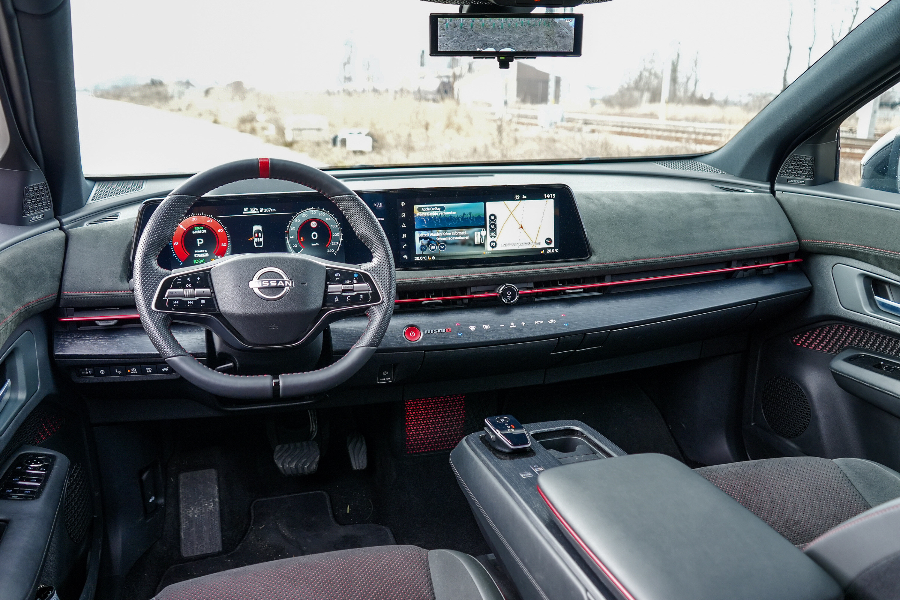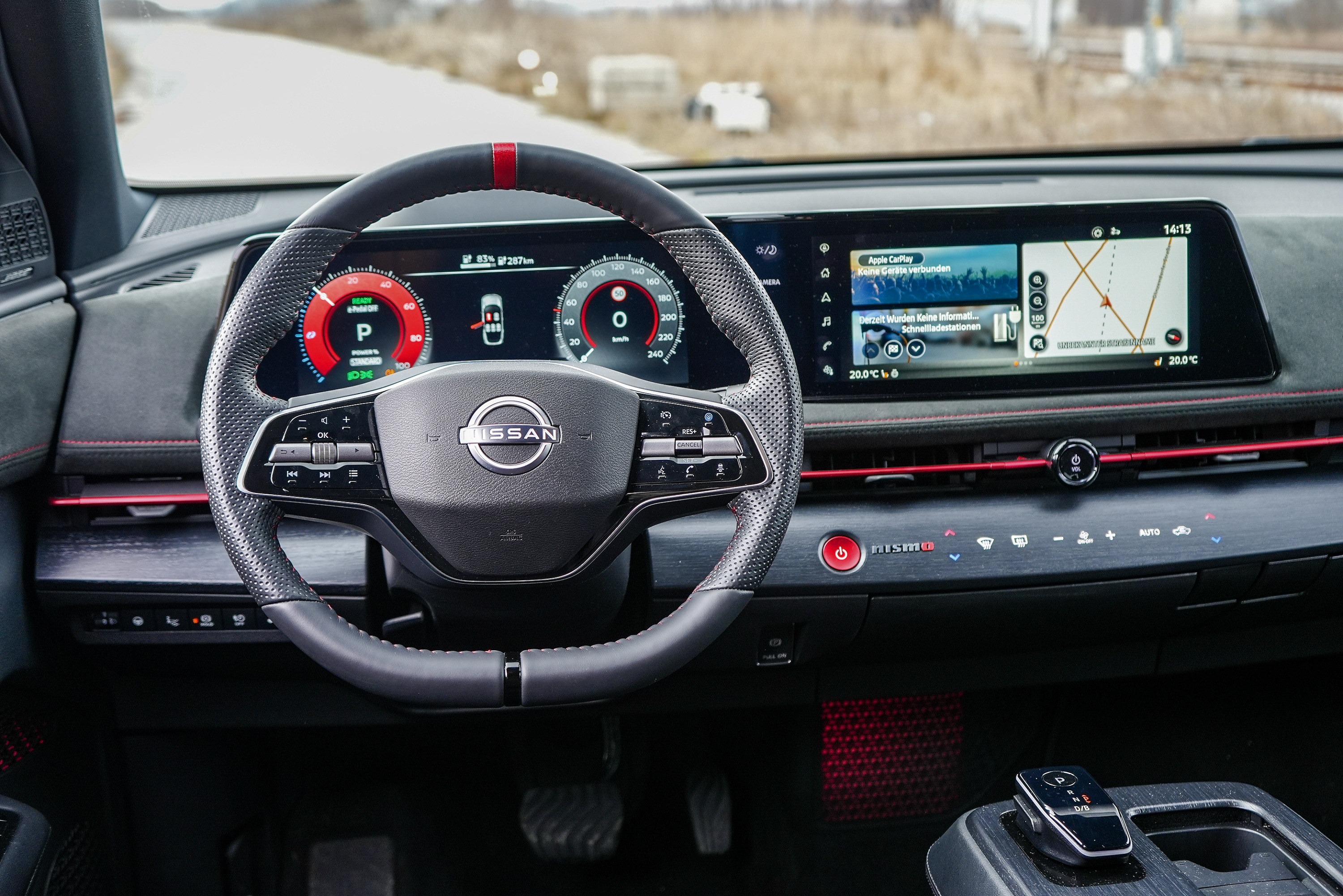 Im Innenraum dominieren Alcantara, rote Kontrastnähte und Nismo-Logos. Die Sportsitze bieten spürbar mehr Seitenhalt als in der zivilen Version, wirken optisch jedoch weniger radikal, als der Name vermuten lässt. Die Sitzposition bleibt konstruktionsbedingt SUV-typisch hoch. Man sitzt über der Technik – nicht tief eingebettet wie in einem klassischen Sportwagen. Weniger erfreulich: Trotz eines Einstiegspreises von 65.390 Euro übernimmt der Ariya Nismo nahezu unverändert die Hardware des regulären Modells. Die Touchtasten im Holzdekor unterhalb des Infotainment-Screens sehen hochwertig aus, reagieren jedoch nicht immer präzise. Auch das Infotainmentsystem selbst wirkt im Jahr 2026 nicht mehr ganz auf Höhe der Zeit. Gerade im Vergleich zu Wettbewerbern aus Korea oder den USA fehlt es an Geschwindigkeit und grafischer Modernität.