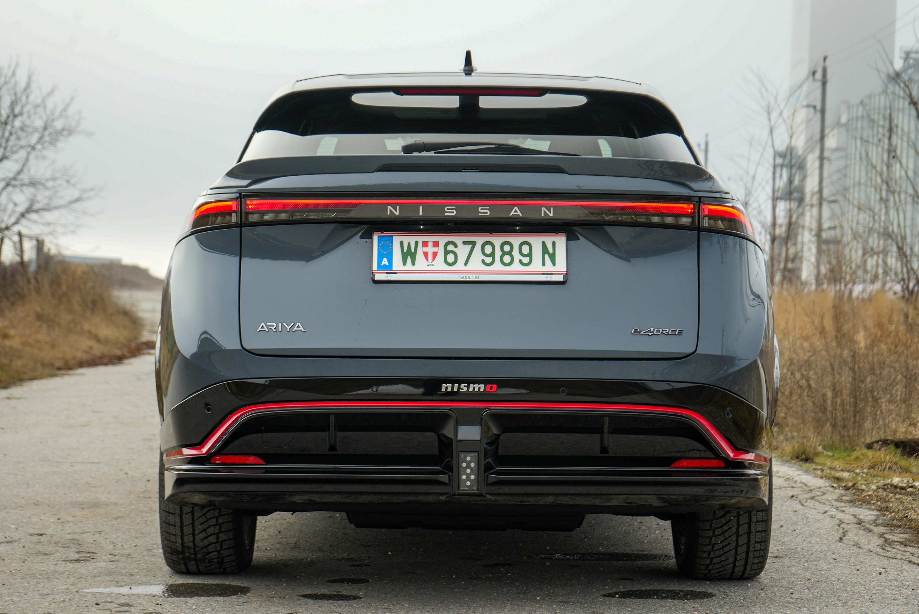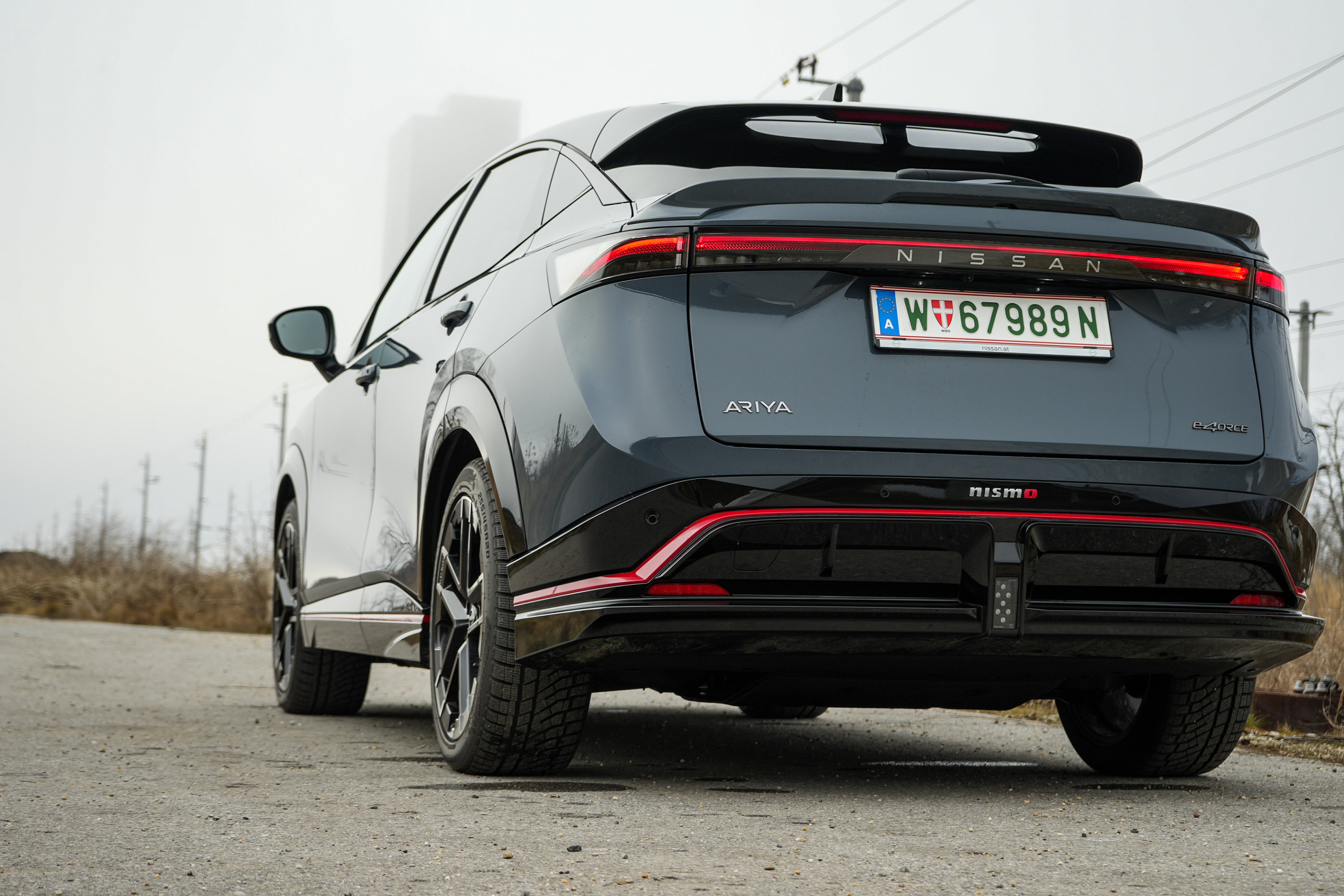 Beim ersten Rundgang wird klar: Der Ariya Nismo setzt nicht auf Understatement. Neue Schürzen lassen ihn mit 4,66 Metern Länge minimal wachsen. Doch hier folgt die Form der Funktion: Der zweiteilige Dachspoiler und der markante Diffusor sollen den Auftrieb laut Nissan um bis zu 40 Prozent reduzieren. Im wuchtigen Doppeldiffusor sitzt zentral die Nebelschlussleuchte – eine klare Hommage an Formel 1 und Formel E. Ein Detail, das man bereits vom Nissan 370Z Nismo oder der Toyota Supra kennt. Die rote Nismo-Linie zieht sich konsequent um das gesamte Fahrzeug, die exklusiven 20-Zoll-Felgen wirken bullig. Und doch bleibt der Kern unverändert: ein großes, 2,3 Tonnen schweres Elektro-SUV.