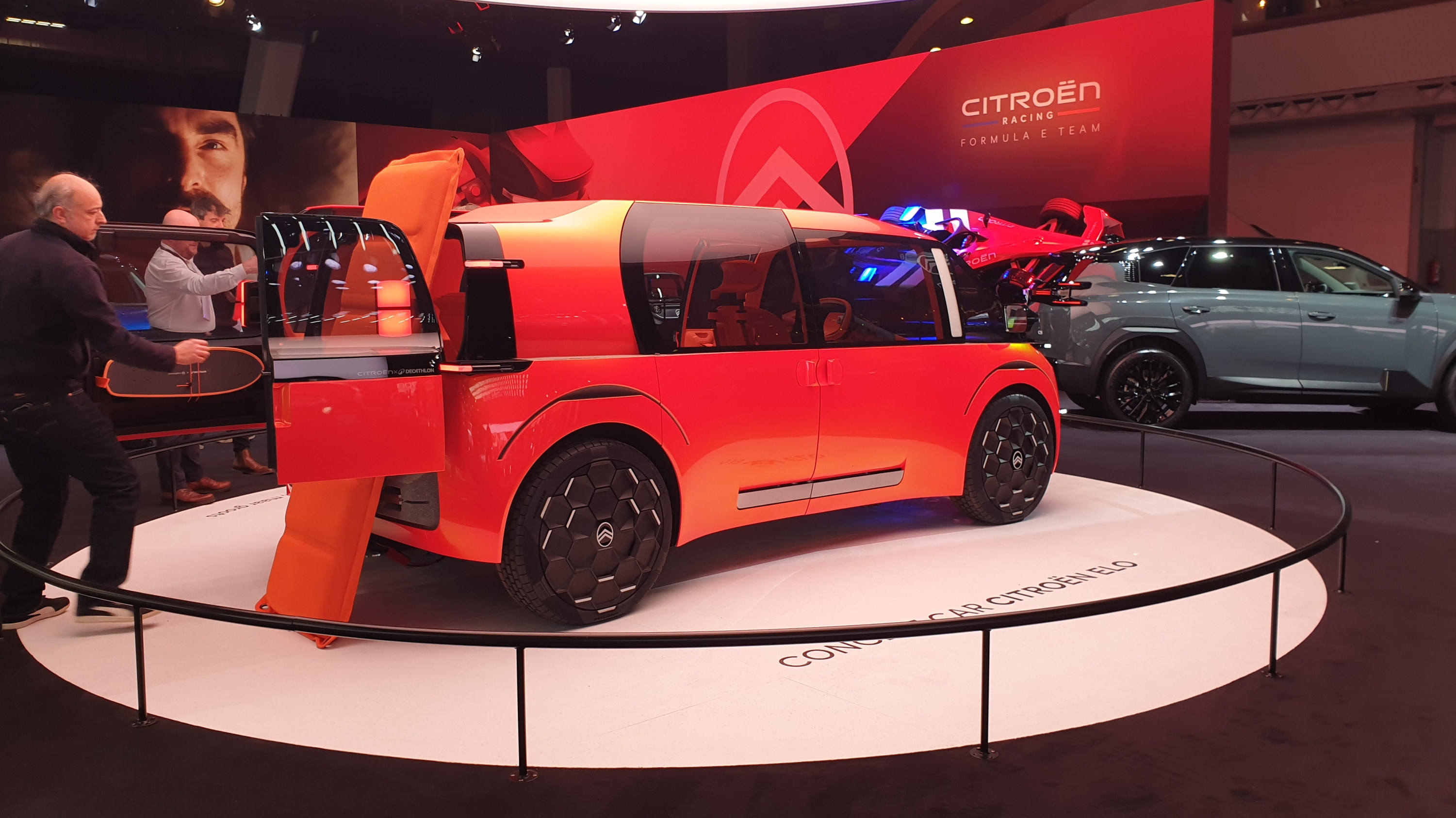 Um 09Uhr40 dann der leuchtende Messeauftritt des Konzeptfahrzeugs Citroën ELO (rEst, pLay, wOrk). Der kompakte Sechssitzer (!) mit 4,1 Meter Außenlänge und 1,7 Meter Höhe ist ein Ideenlabor auf vier Rädern – „das kleine Auto, das groß denkt“: verantwortungsbewusst, funktional, clever, vielseitig, zugänglich und ausgesprochen freundlich. Der heckangetriebene Stromer setzt auf langlebige und innovative Materialien, die gemeinsam mit Goodyear und Decathlon entwickelt wurden. Dank zentral angeordnetem Fahrersitz und 180-Grad-Windschutzscheibe bietet der ELO ein ungewohntes Sichtgefühl. Die vier Seitentüren öffnen sich in entgegengesetzte Richtungen, und da keine Mittelsäule vorhanden ist, ist der Einstieg 1,92 Meter breit. Der Boden ist komplett eben. 4,5 Quadratmeter Glasfläche lassen viel Licht in den Innenraum. „ELO revolutioniert die Mobilität und wird zum Katalysator für gemeinsame Momente mit dem Partner, der Familie oder Freunden.“, so die Pressemitteilung. Ich bin gespannt, was es von der Studie in den nächsten Jahren in die Serie schafft.